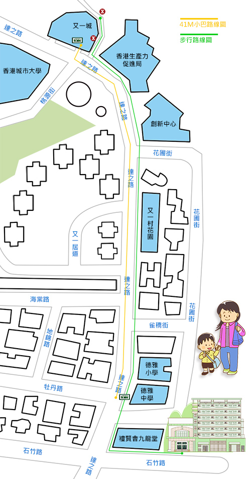 於又一城乘坐小巴2A/41M,在德雅中學下車(地圖橙色線),車程約3-5分鐘。 |